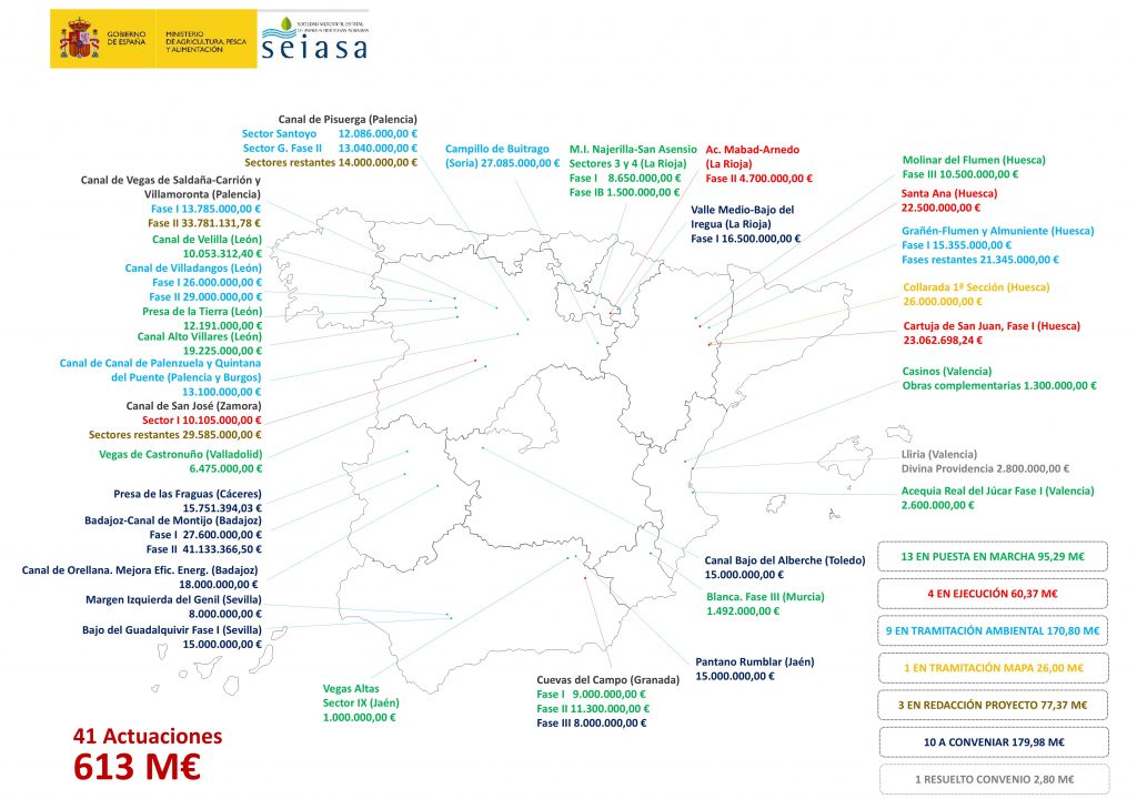 En la actualidad, SEIASA gestiona un total de 137 obras de modernización de regadíos (entre el Plan de Recuperación, Transformación y Desarrollo y el denominado Convenio Tradicional o Clásico) en distintos grados de desarrollo, que suman una inversión de 1.946 millones de euros.
